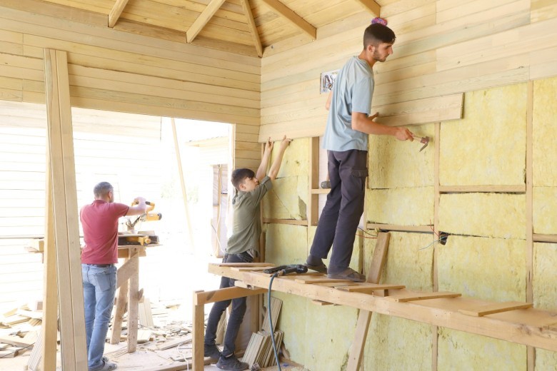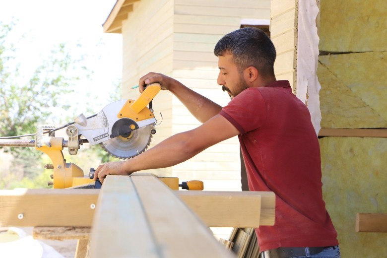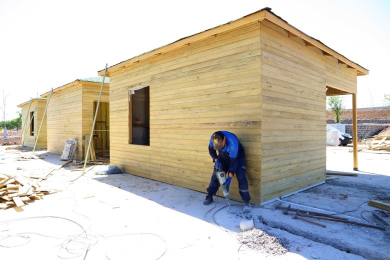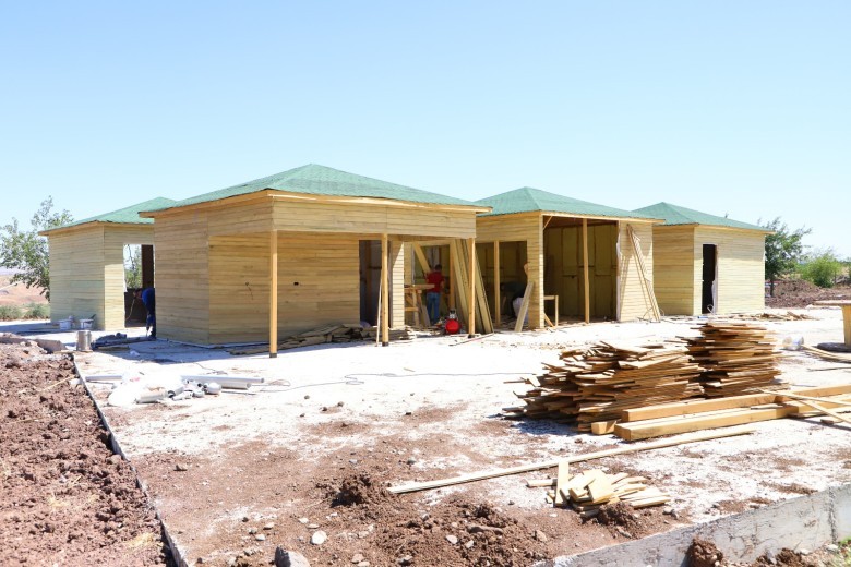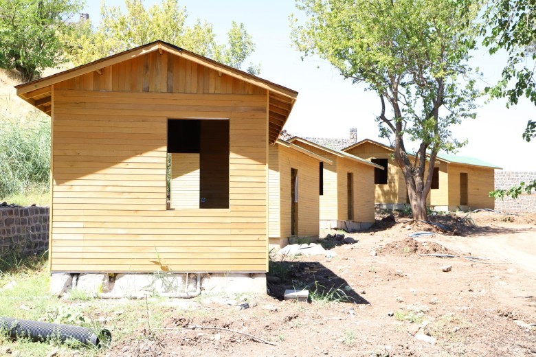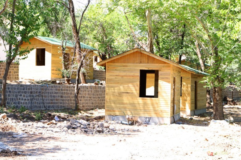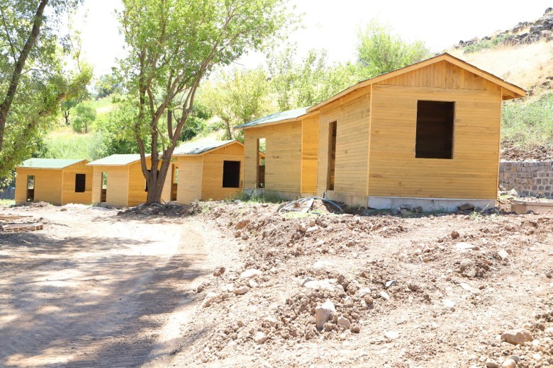 Bu kapsamda alanda peyzaj, bitkilendirme ve çevre düzenleme çalışmalarını sürdüren ekipler, belirlenen alanlara 21 metrekare genişliğinde 21 bungalov ev ve çamaşır, ütü, erkek-kadın tuvaleti, market ve kafeden oluşan 6 ahşap sosyal ünite evi inşa etti.